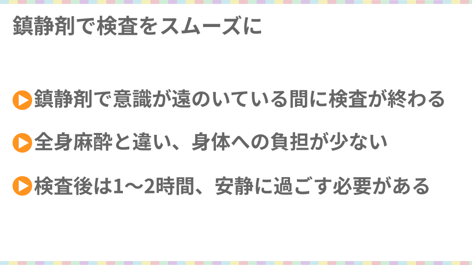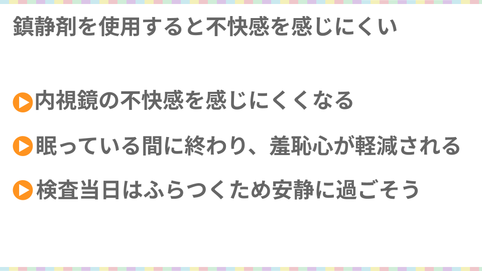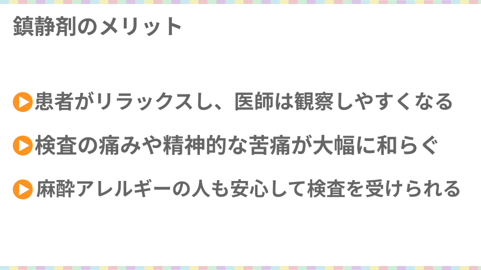 また、肛門を見られるなどの精神的苦痛も、意識が遠のいている間に検査が行われれば軽減することが可能ですね。