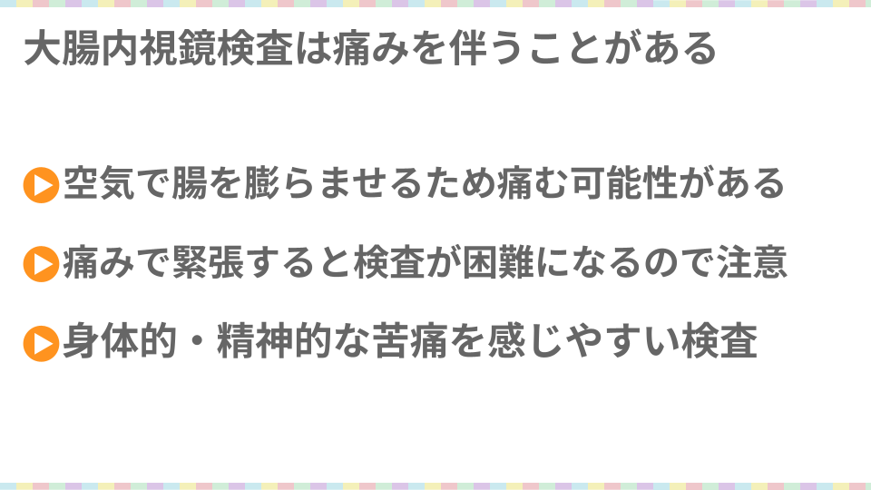 痛みを感じると呼吸が浅くなり、緊張で大腸が収縮してしまいます。すると余計に内視鏡が入りにくくなり、痛がっていても無理やり押し込めるしかありません。