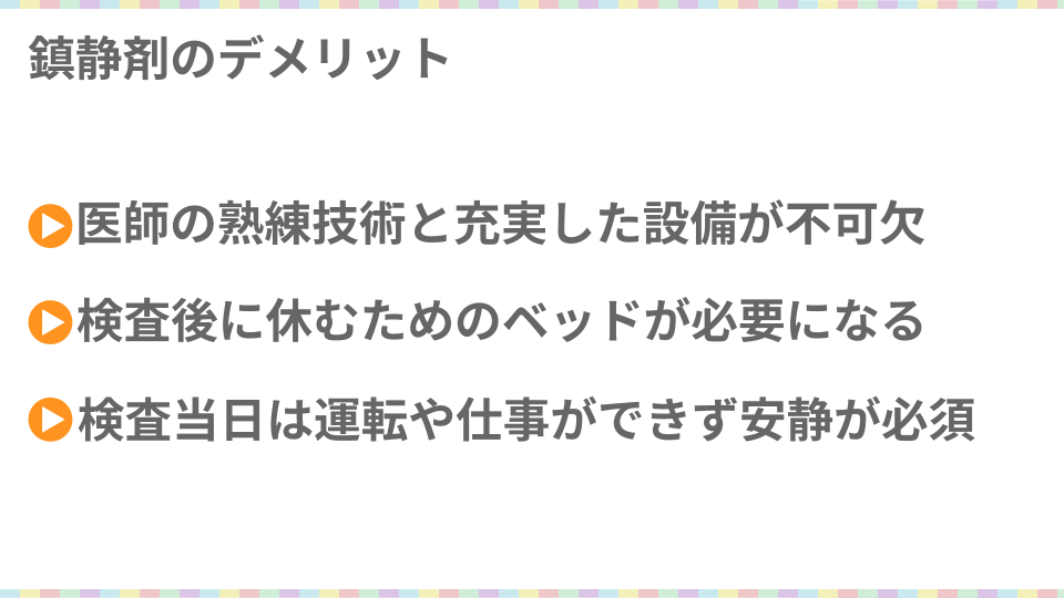 どの病院でも気軽に鎮静剤を打ってくれるというわけではないので、検査の前には病院をよく調べ、必要であれば鎮静剤を打ってくれるかどうかの確認をしておく必要があります。